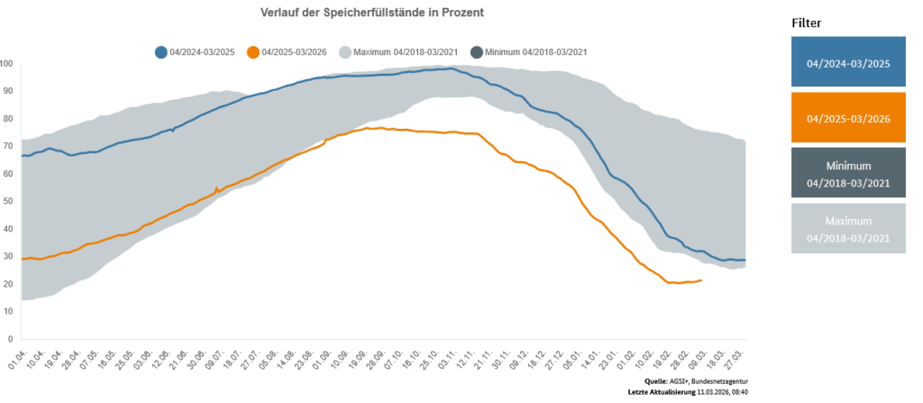 Savezna mrežna agencija pomno prati događaje na Bliskom istoku. Plin iz Perzijskog zaljeva ne igra značajnu ulogu u opskrbi Njemačke, budući da Njemačka trenutno dobiva svoje isporuke LNG-a iz SAD-a. Postoje cjenovni učinci na globalnim tržištima koji bi se mogli osjetiti i u Njemačkoj, ovisno o trajanju sukoba. Ovi cjenovni učinci neće imati neposredan utjecaj na dugoročne ugovore, poput onih koje imaju privatna kućanstva, jer ti ugovori uključuju jamstva cijena. Čak ni tvrtke koje osiguravaju svoju opskrbu putem terminskih tržišta neće odmah osjetiti ove cjenovne učinke. Hoće li i u kojoj mjeri trenutni učinci cijena dosegnuti kupce, stoga ovisi o trajanju sukoba i ugovornim sporazumima.