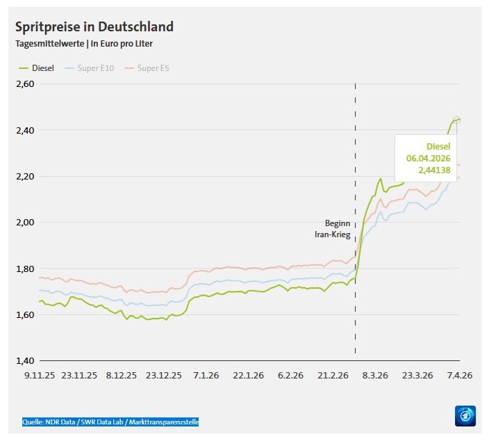 Cijene goriva u Njemačkoj nastavljaju rasti unatoč podnevnom pravilu. Dizel je danas sedmi dan zaredom dosegao novi rekord svih vremena. Prosječna cijena dizela na nacionalnoj razini prvi put je premašila 2,50 eura po litri.